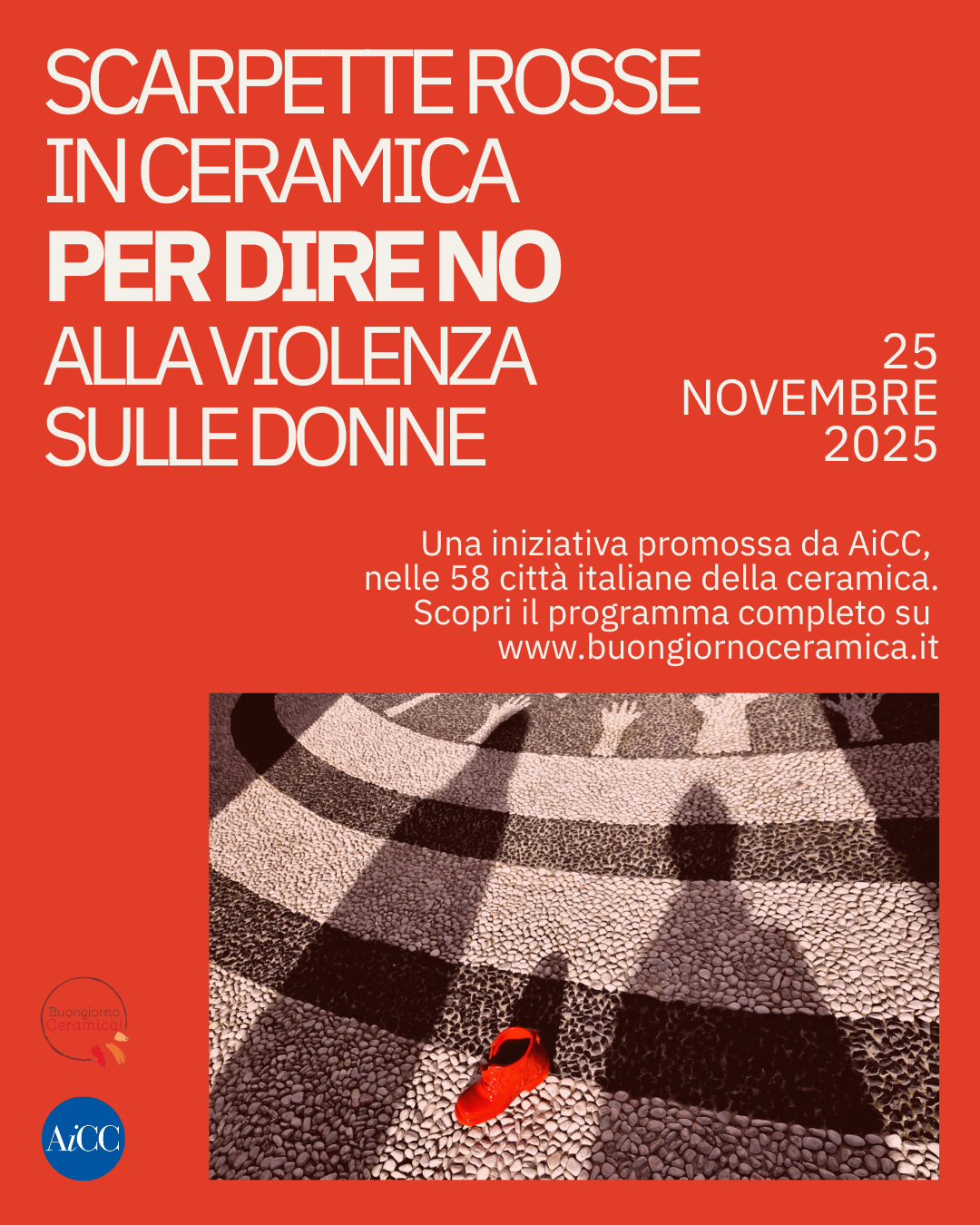 Tutto questo è Scarpette rosse in ceramica, un’iniziativa il cui valore pubblico è ben riassunto dalle parole del Presidente dell’AiCC, Massimo Isola: “Questo evento rappresenta per noi un progetto di profondo valore simbolico e culturale, al quale siamo particolarmente legati. È il risultato di un impegno corale e diffuso su tutto il territorio nazionale, che unisce le Città italiane della Ceramica in un percorso condiviso di ideazione e crescita. Attraverso nuove programmazioni, attività, percorsi narrativi ed espositivi, questo progetto intende promuovere una riflessione collettiva, valorizzando al tempo stesso l’arte ceramica come strumento di dialogo, espressione e consapevolezza sociale”.
